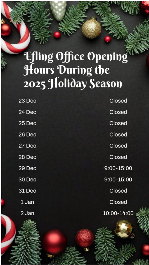The Efling Union office will be closed on 23 December, Þorláksmessa. The office will reopen on 29 December, at the regular time of 9:00. It will be open that day and on 30 December, but closed on New Year’s Eve, 31 December.
