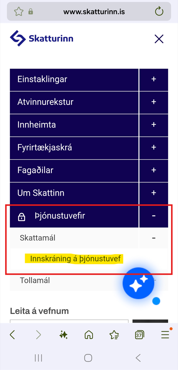 Því næst þarftu að smella á plúsinn við Þjónustuvefir – Skattamál og smellt á Innskráning á Þjónustuvef til þess að skrá þig inn með rafrænum skilríkjum.