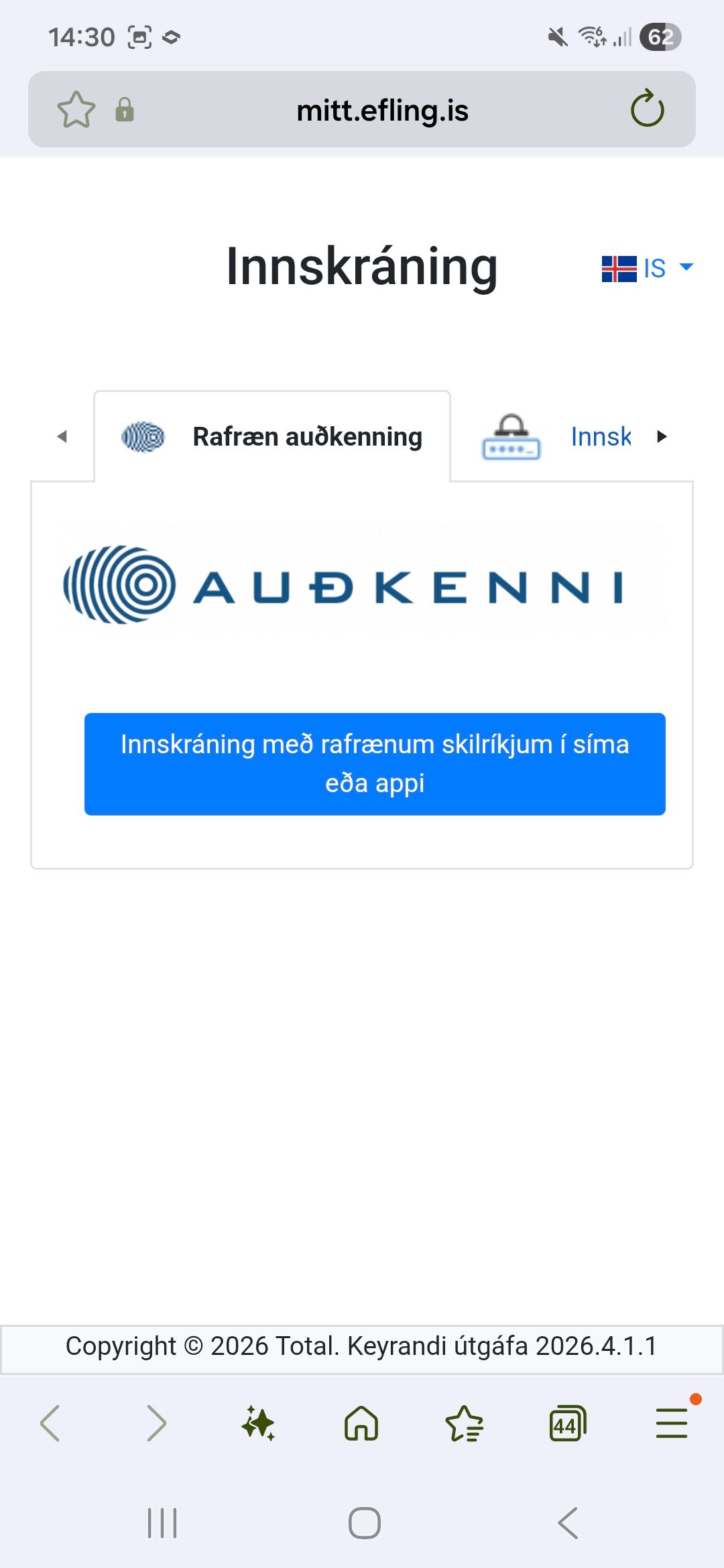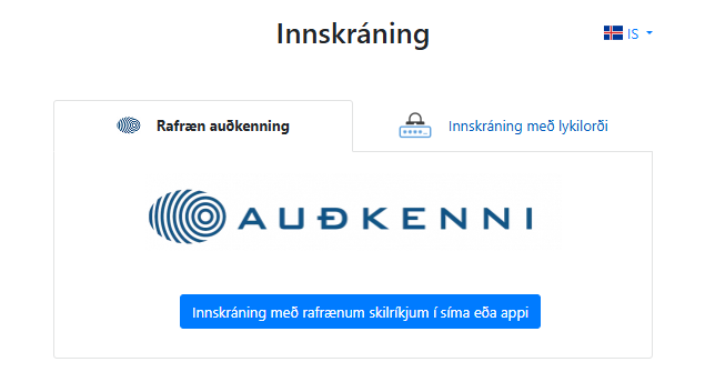 Byrjaðu á því að skrá þig inn á þjónustuvefinn með rafrænum skilríkjum með því að velja Þjónustuvefir