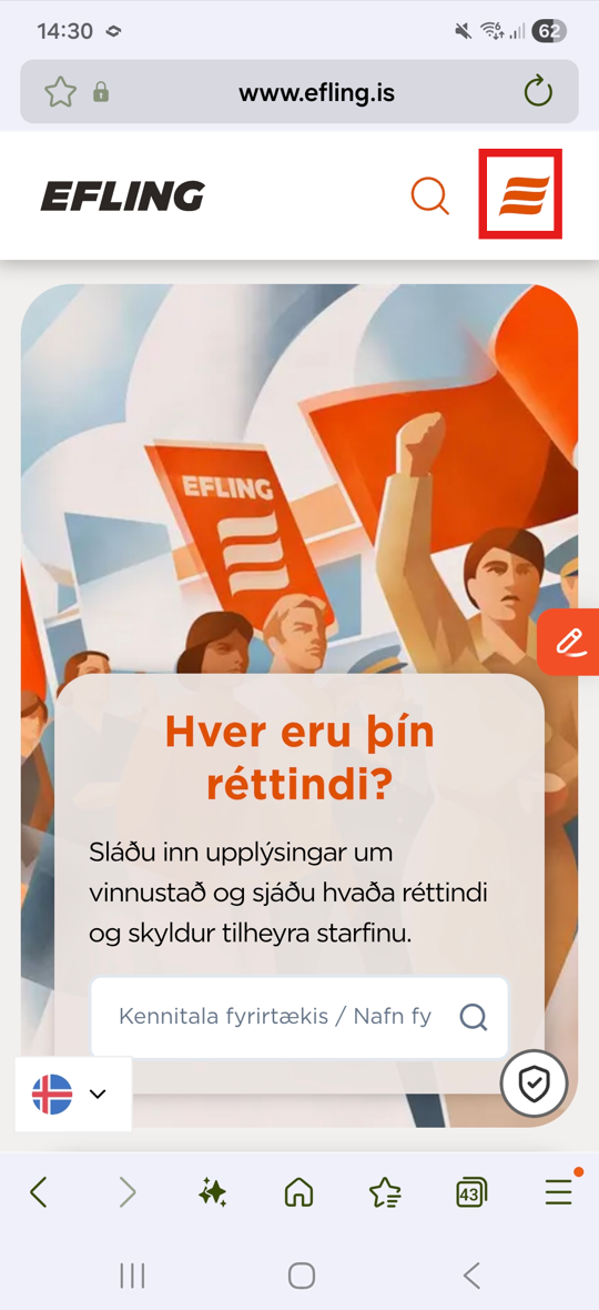 Til þess að skrá sig inn á Mínar síður þarf að smella á Eflingar myndina efst í hægra horni.