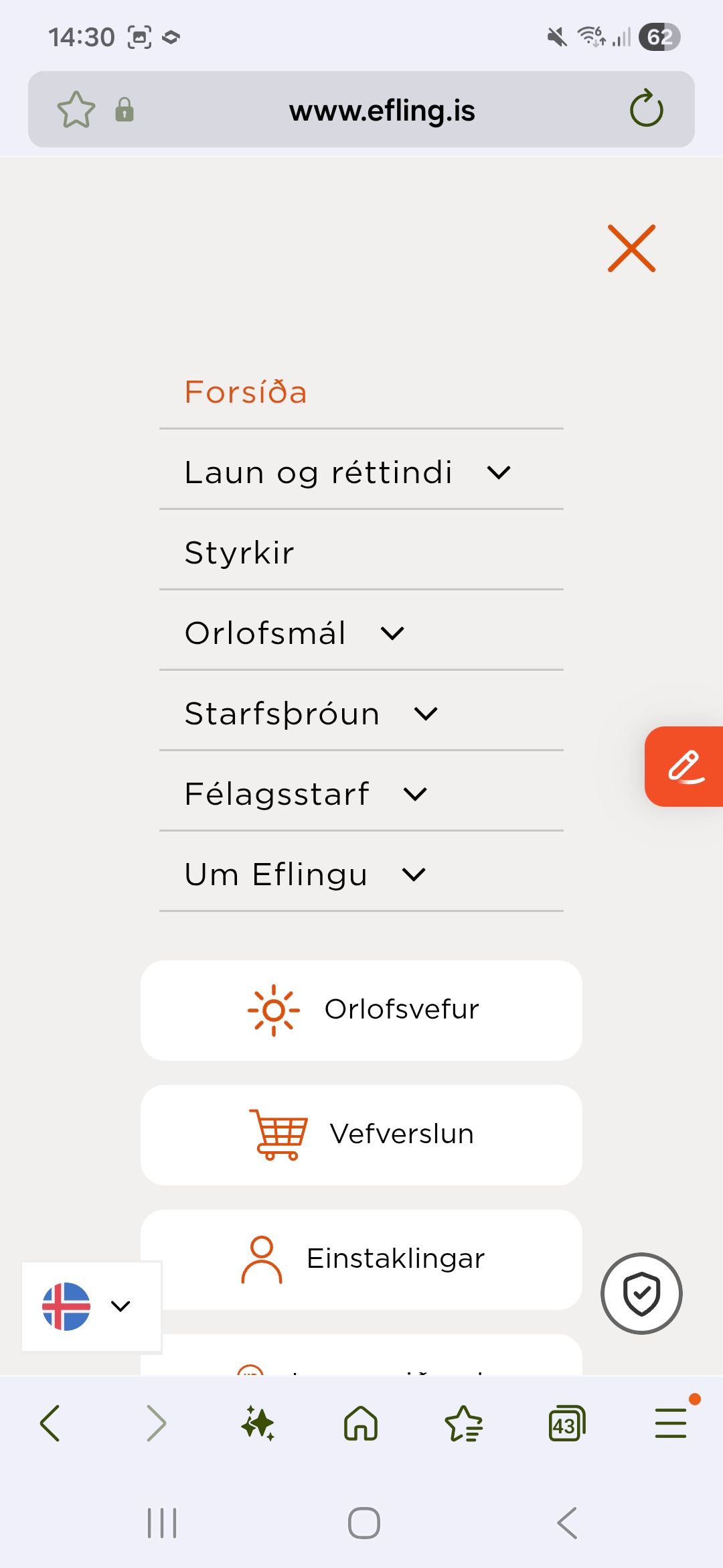 Til að komast inn á bókunarsíðuna er smellt á bláa takkann Orlofskerfi. Þar er einnig hægt að smella á Sækja um orlofsstyrkur (sjá nánar undir Styrkir - Styrkir | Efling stéttarfélag)