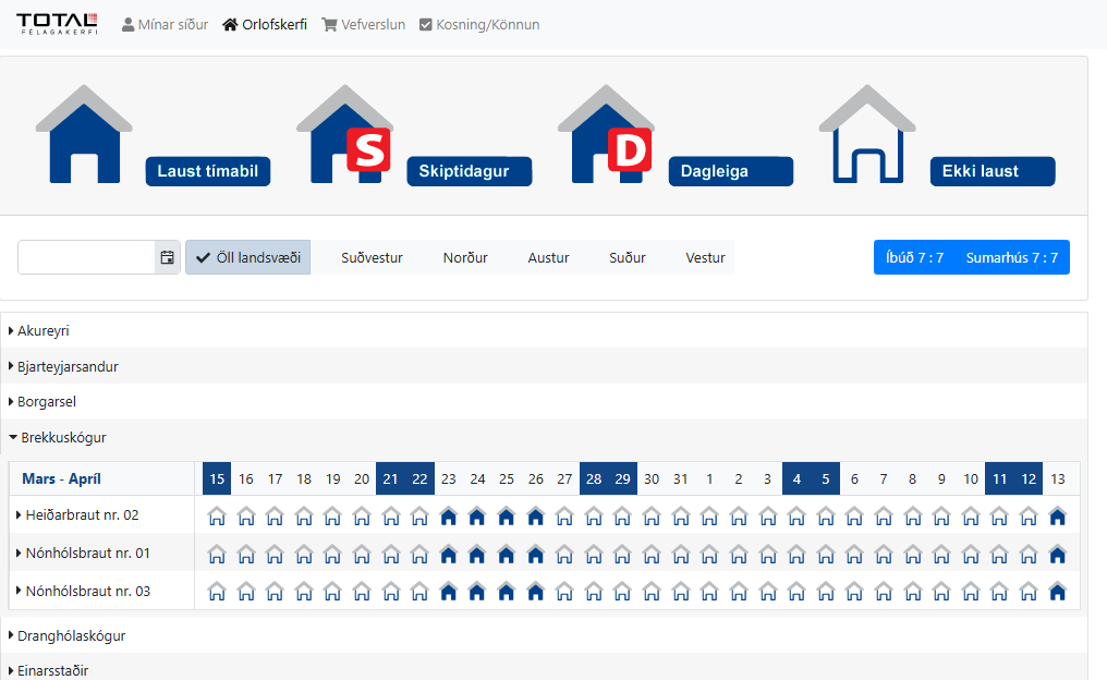 Á bókunarsíðunni sjást landsvæðin með orlofseignum félagsins, eftir hverfum, og um leið sést bókunarstaða hverrar eignar á viðkomandi tímabili (á mynd hefur Brekkuskógur verið valinn).