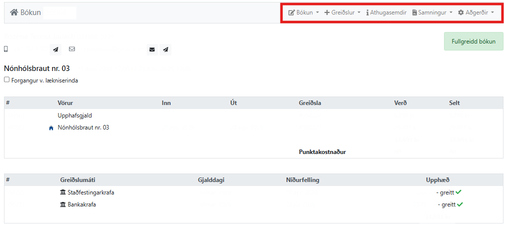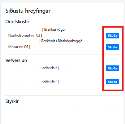 Hægt er að skoða bókanir húsa og kaup í vefverslun undir ''Síðustu hreyfingar'' og þar er hægt að smella á skoða og fá upp aðgerðasíðu og meðal annars hægt að nálgast leigusamning þar sem er að finna ýmsar mikilvægar upplýsingar um húsið.