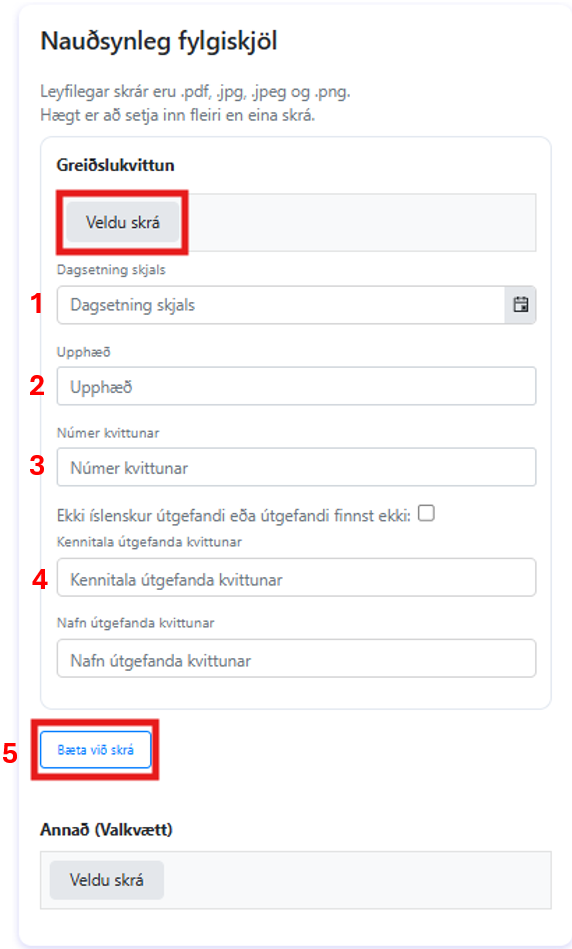 Næst þarf að setja inn viðeigandi fylgiskjöl með því að smella á „Veldu skrá'' og fylla þarf inn réttar upplýsingar (nr. 1, 2, 3 og 4). Ef þörf er á að hengja við fleiri en eitt skjal eða greiðslukvittun er það gert með því að smella á „Bæta við skrá'' (nr. 5). Hægt er að hengja við annars konar gögn undir „Annað''